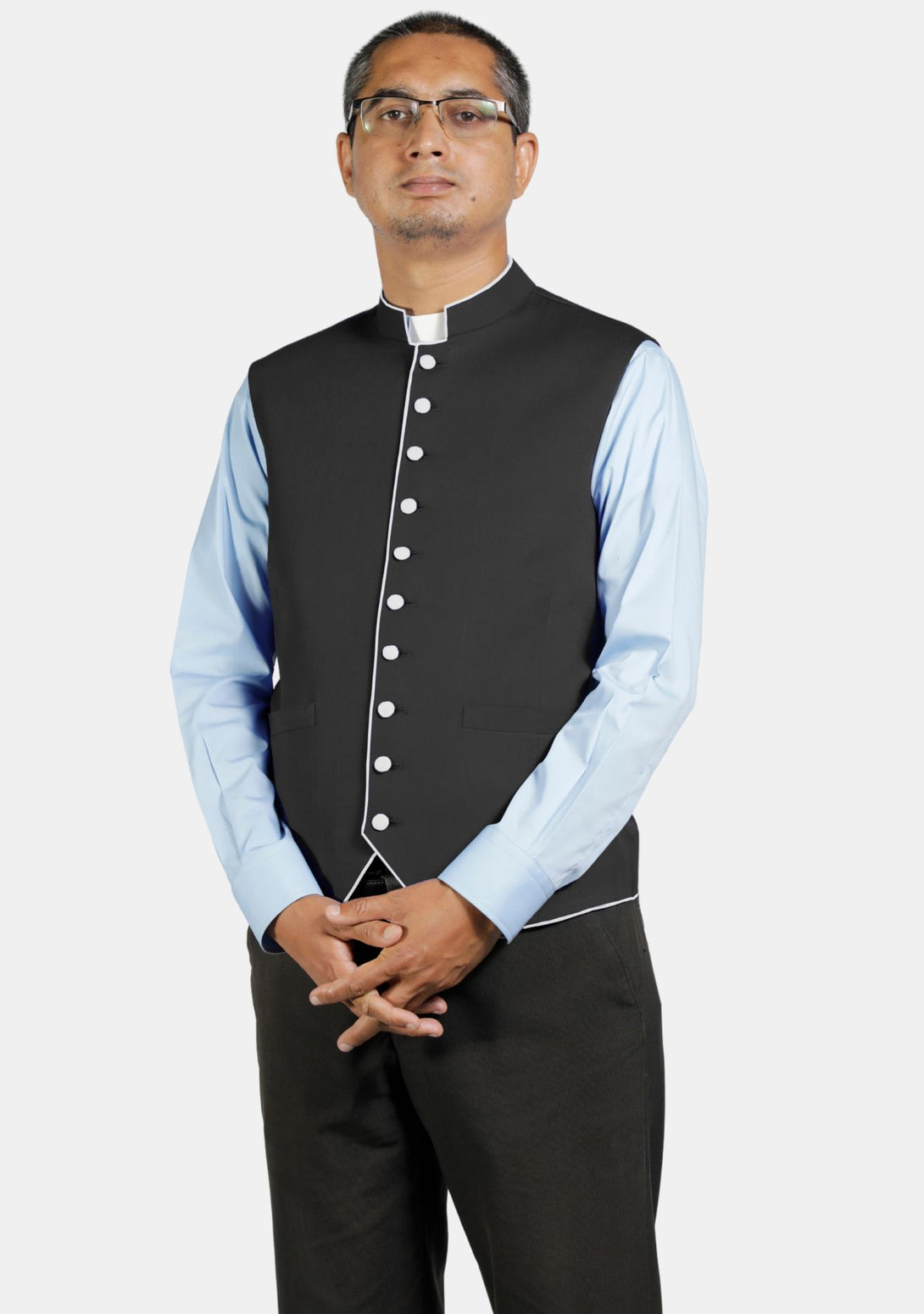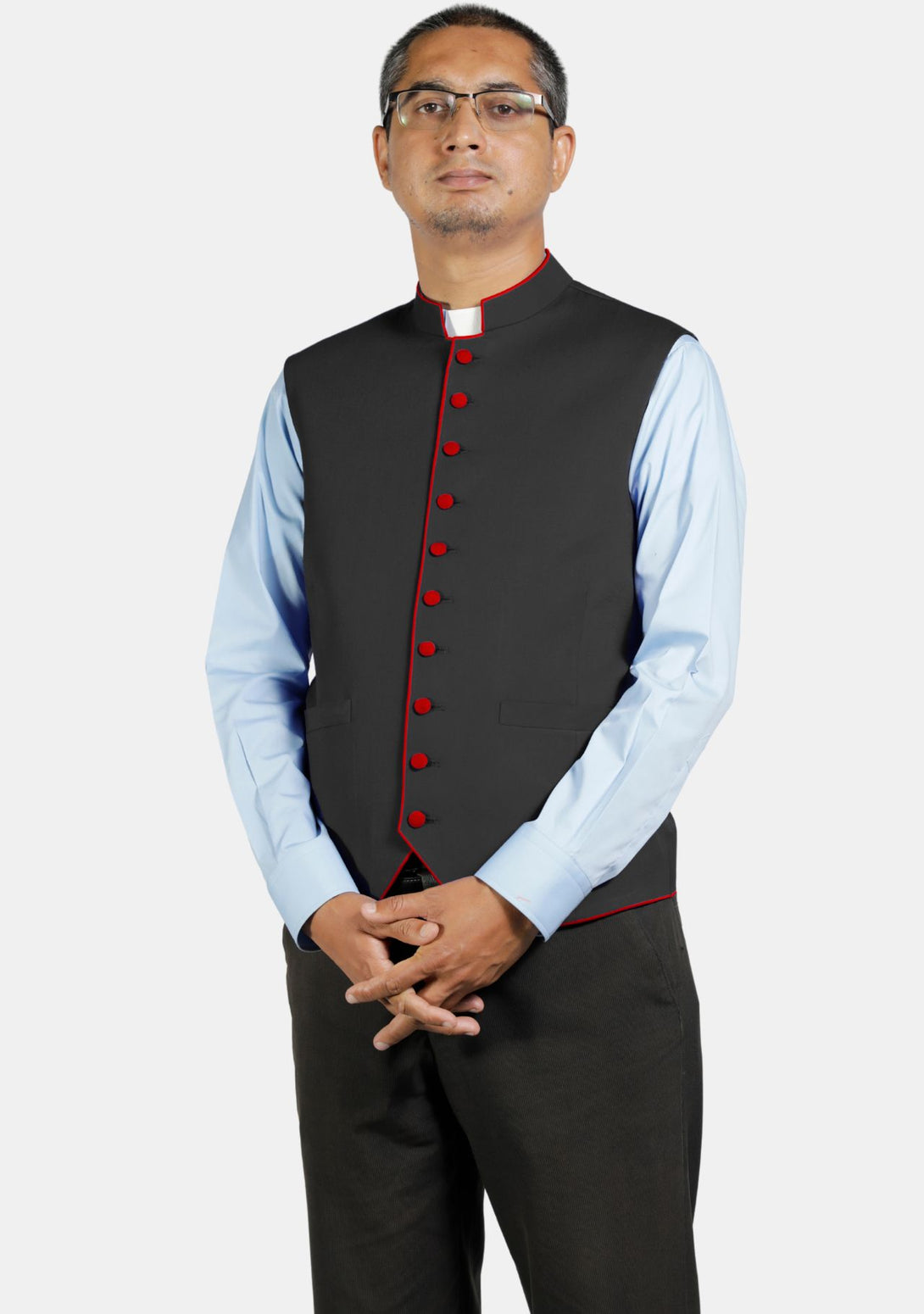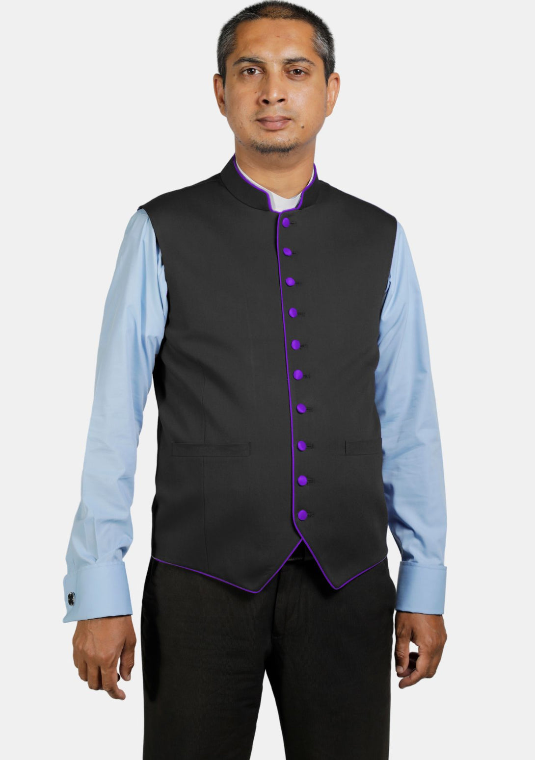 A Black clerical vest is really handy! It has two pockets in the front which are very practical. Also, it has a hidden front part where about 10 buttons are nicely covered with fabric. This makes the vest look smooth and stylish. A clergy vest is perfect for any clergy member because it’s both useful and classy.