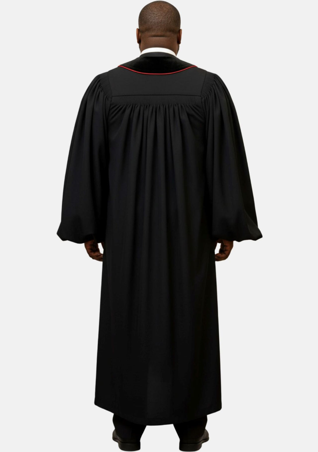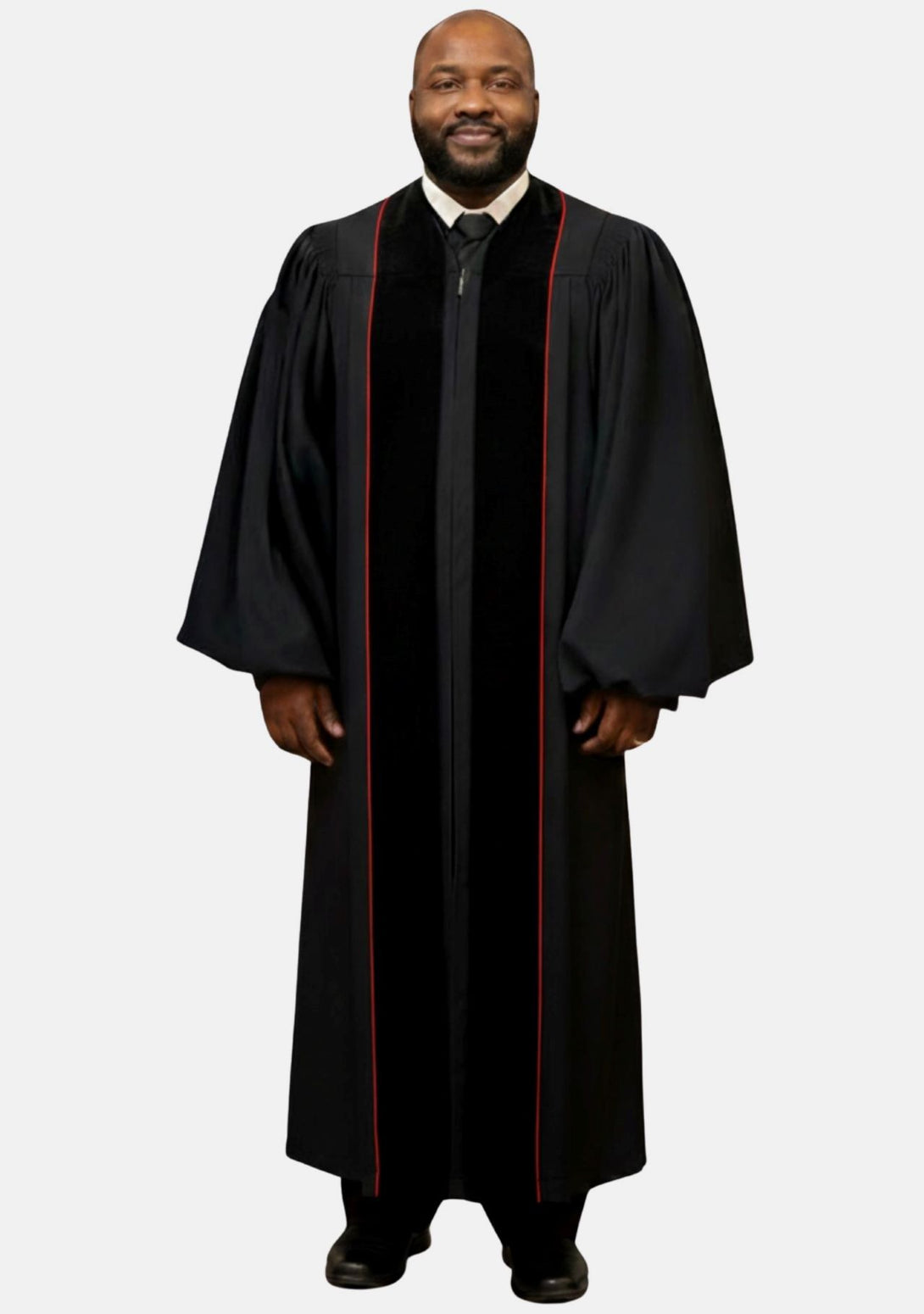 • Classic black clergy robe with bold red contrast lines.
