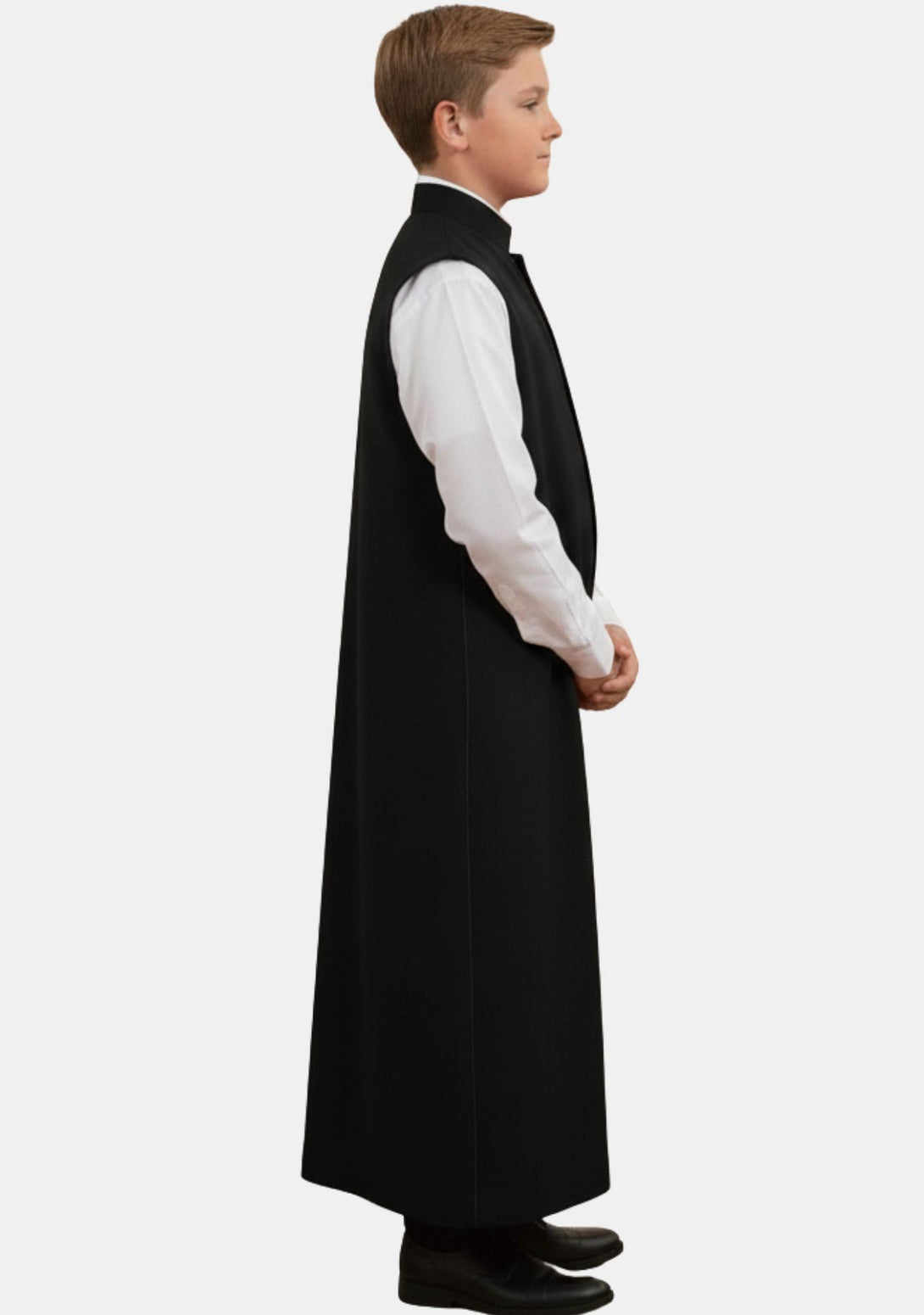 The Dominic Black Sleeveless Altar Boy Cassock is specially designed for young boys serving at church. Its classic black color and sleeveless style make it practical, stylish, and comfortable for daily church duties or special services. Complete the traditional look by pairing it with a white surplice.