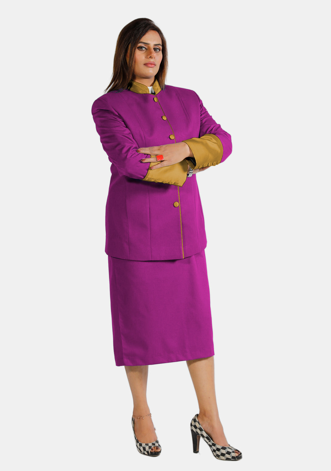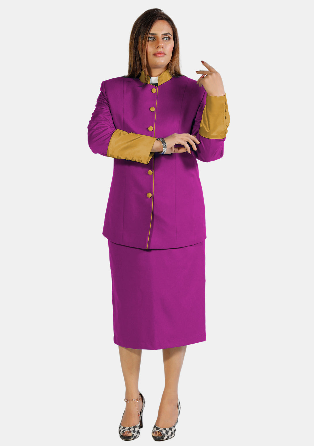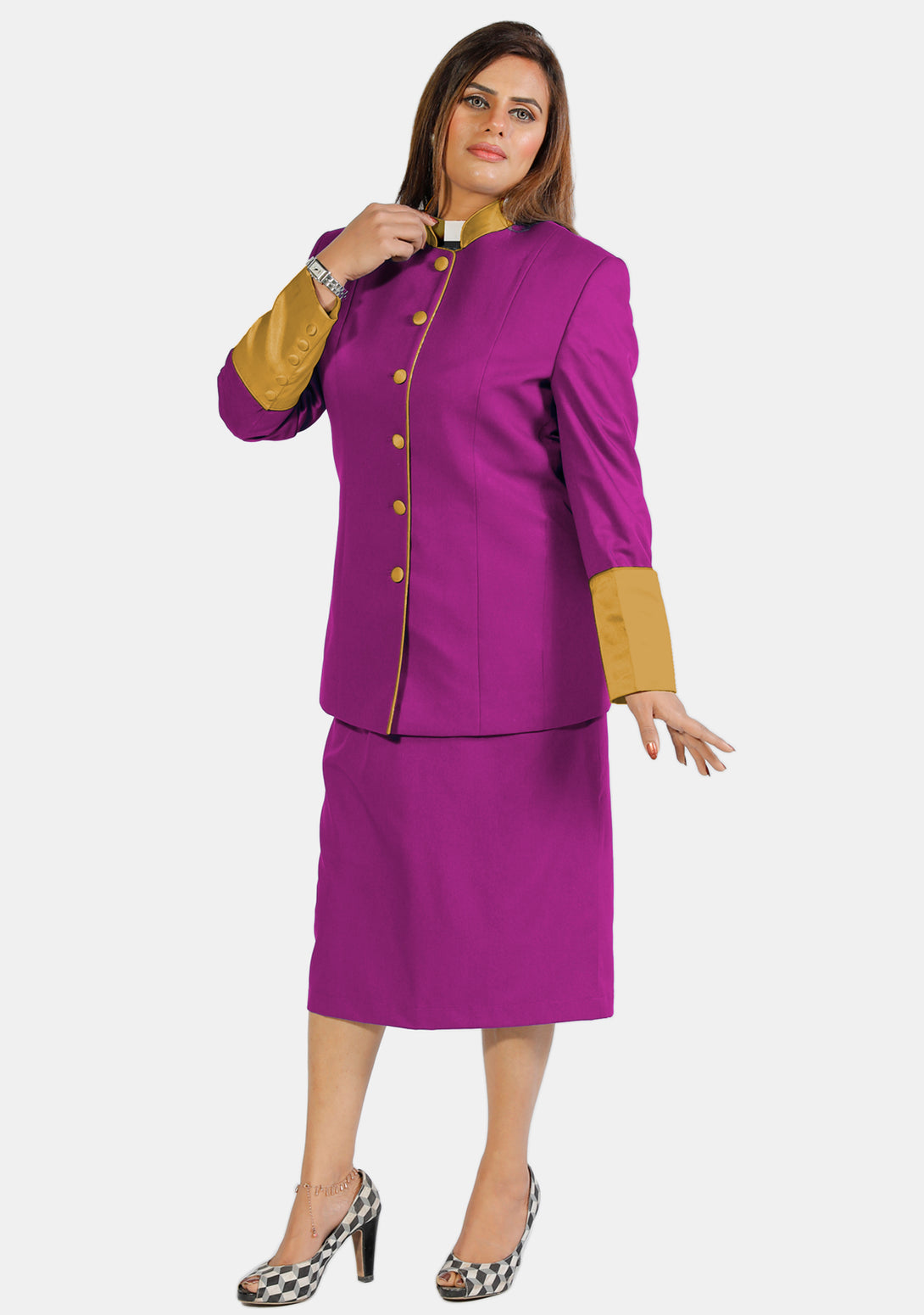 In the past, there was only one traditional style for clergy outfits. Now, our clergy skirt suits are available in many styles, designs, and colors, including the fancy mix of purple and gold. Women can now choose attire that matches their style and showcases the diversity of their ministry, moving away from just the old black robe.