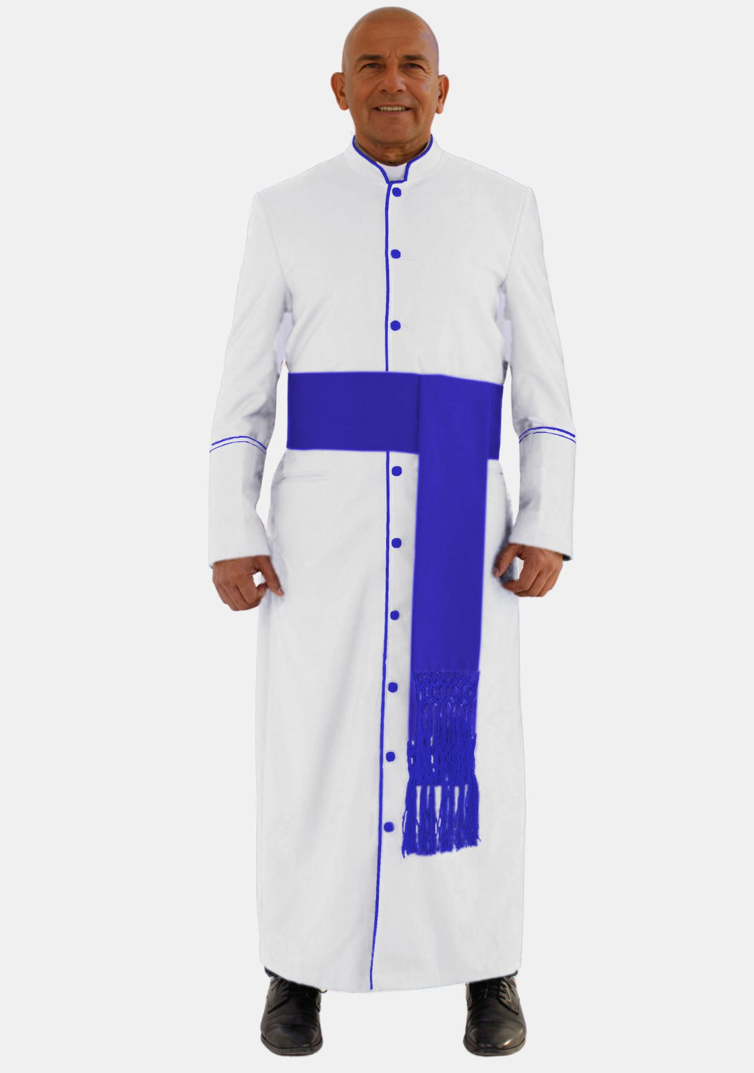 • Style Choices: The robe’s clean white base is accented by royal blue, representing wisdom, stability, and grace. This combination creates a visually striking contrast perfect for formal religious events.