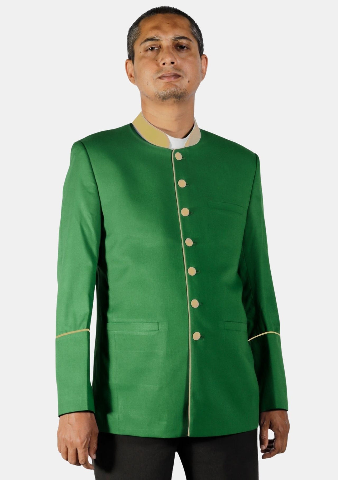 Get ready for something cool – our Men’s Clergy Jacket in Olive Green is just for you! It’s green with gold, made with the best fabric.  The collar is just right for your neck, and the gold parts make it look fancy. A special tailor-made it and you need to keep it clean by dry cleaning. It’s perfect for feeling good and looking awesome!