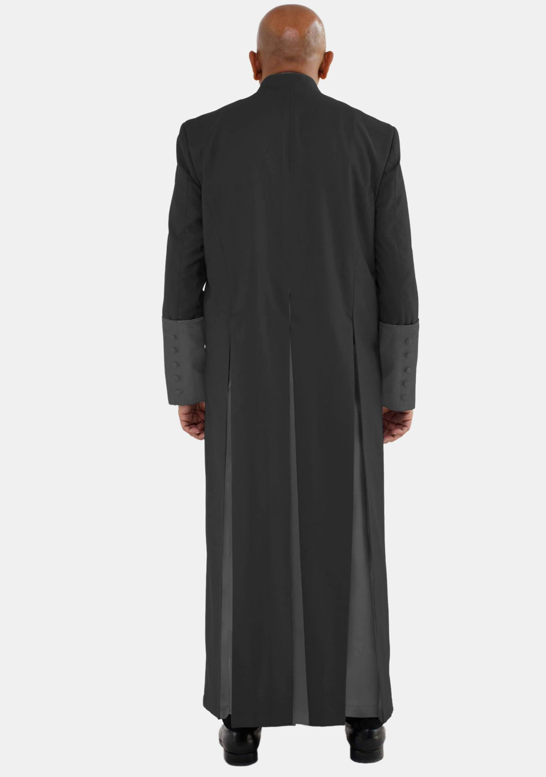 eClergys Andronicus Men's Roman Cassock in Black with Satin Cuff—a garment that not only exemplifies tradition but also adds a modern flair to your ceremonial wardrobe. Meet our Men's Roman Cassock! It's a special long cassock that people wear for important church events. It's all black with some shiny satin on the cuffs—that's the part around your wrists!