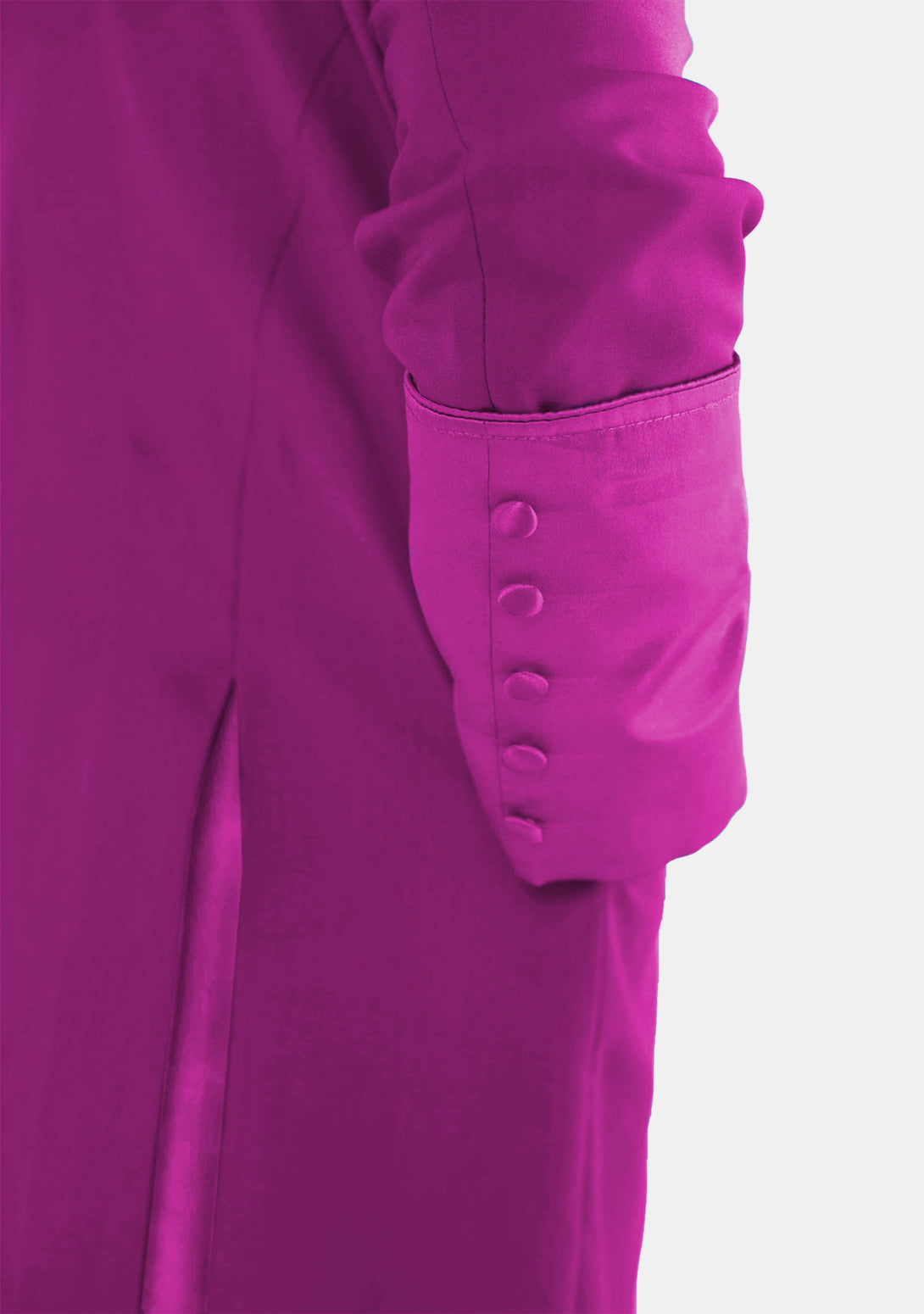 - Red Purple silk trim on the collar, front, cuffs, and hemline.