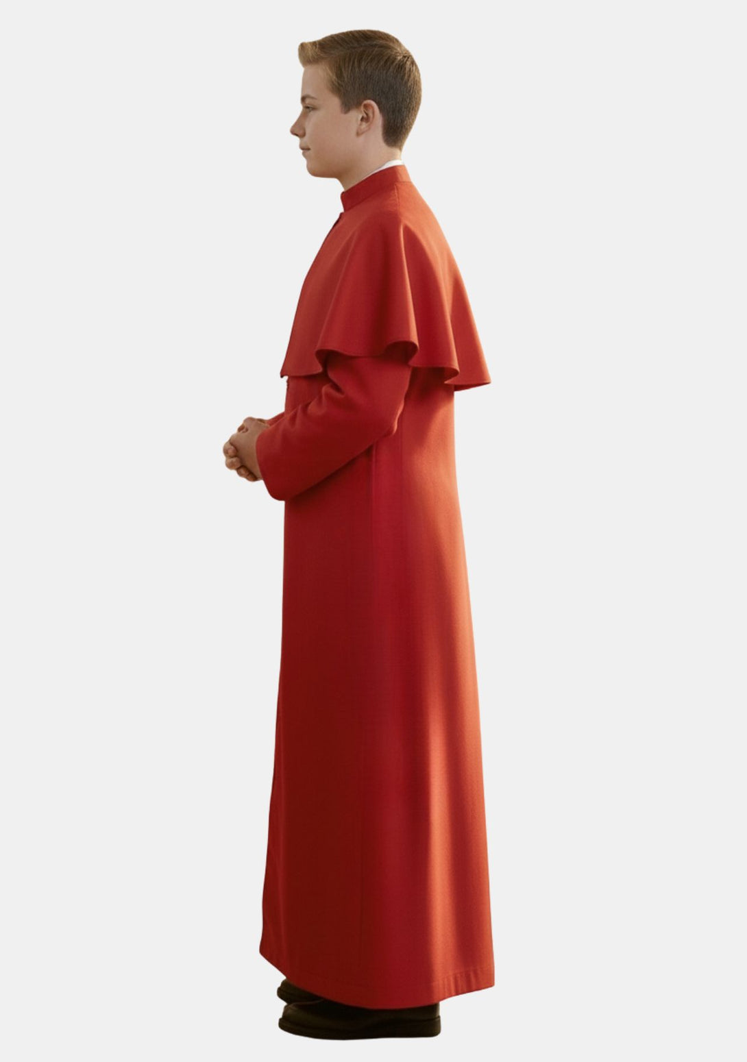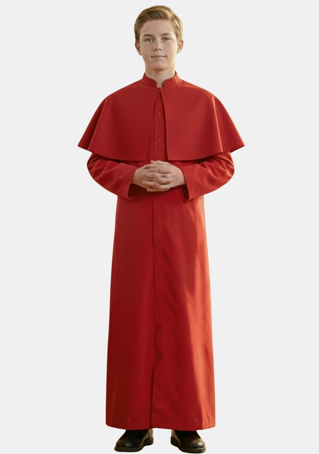 The Axel Sanctis Crimson Cassock is created to bring elegance, dignity, and tradition together for young altar servers. Designed in a rich crimson tone, it offers a classic look that suits church ceremonies, special liturgical events, and sacred celebrations. The shoulder cape adds a timeless touch, giving the wearer a graceful presence while preserving the vestment's deep meaning. Whether used during weekly services or special feast days, this cassock ensures the child looks respectful, polished, and confident in their sacred role.
