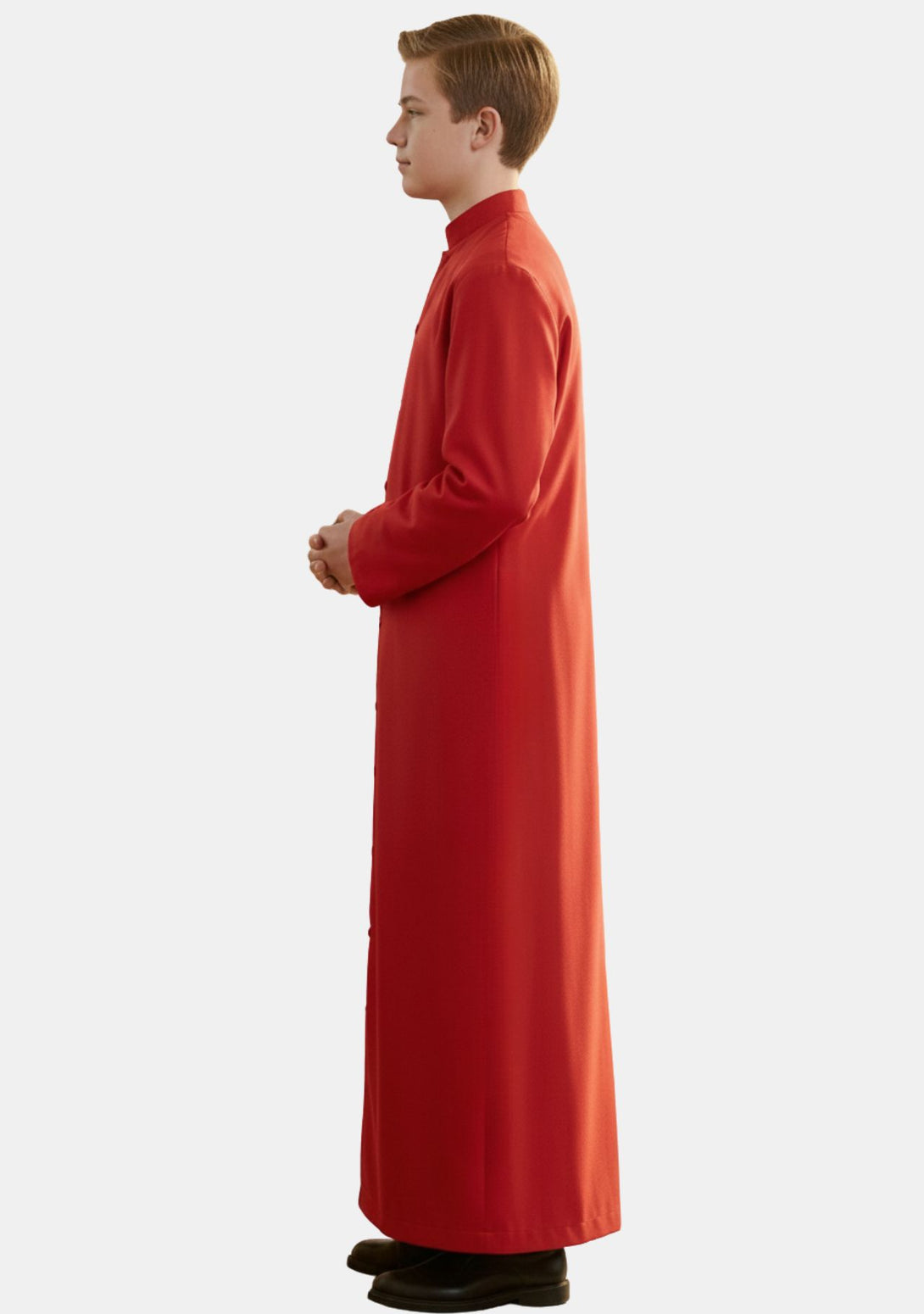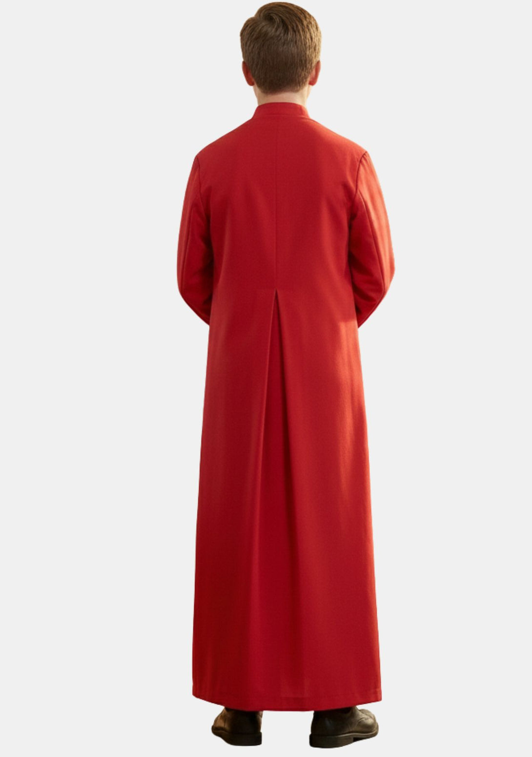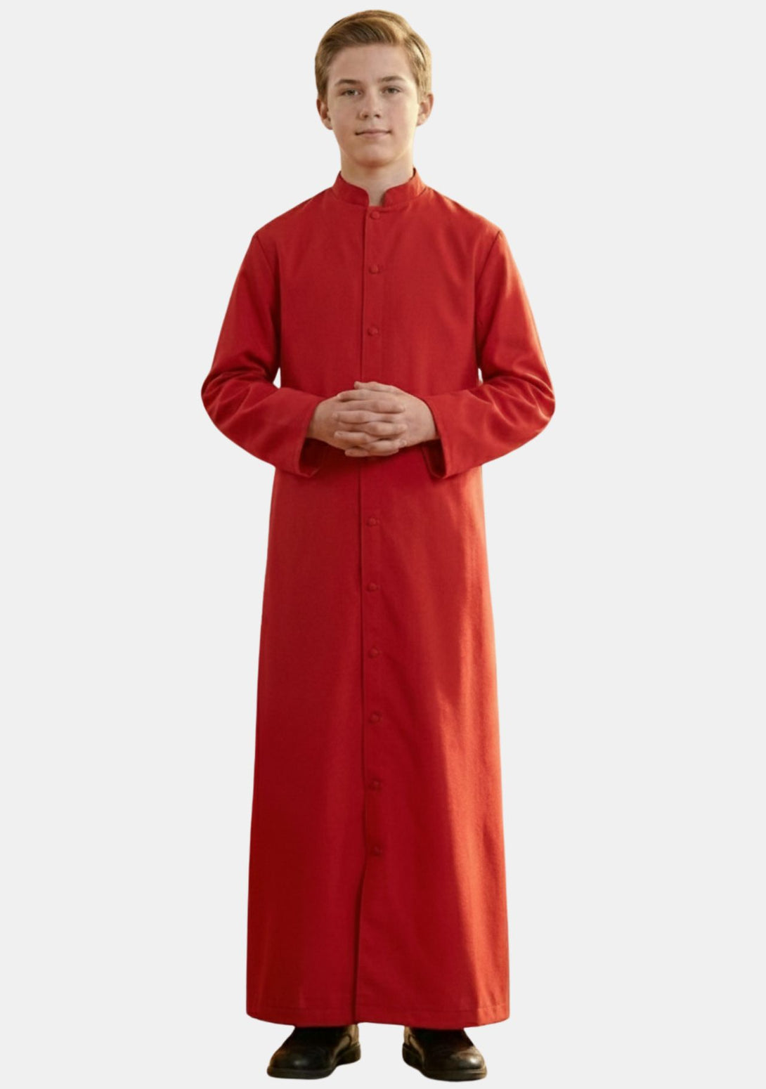 Perfectly suited for altar serving, choirs, processions, and various church functions, the Axel Sanctis Crimson Cassock is designed to bring dignity and harmony to every moment of worship. Its wrinkle-resistant fabric makes it easy to maintain, while the strong stitching ensures it holds its shape during regular use. When paired with a white surplice, it creates a reverent and balanced ensemble that enhances traditional church attire. This cassock helps every young server perform their sacred duties with pride, reverence, and a beautifully composed appearance.