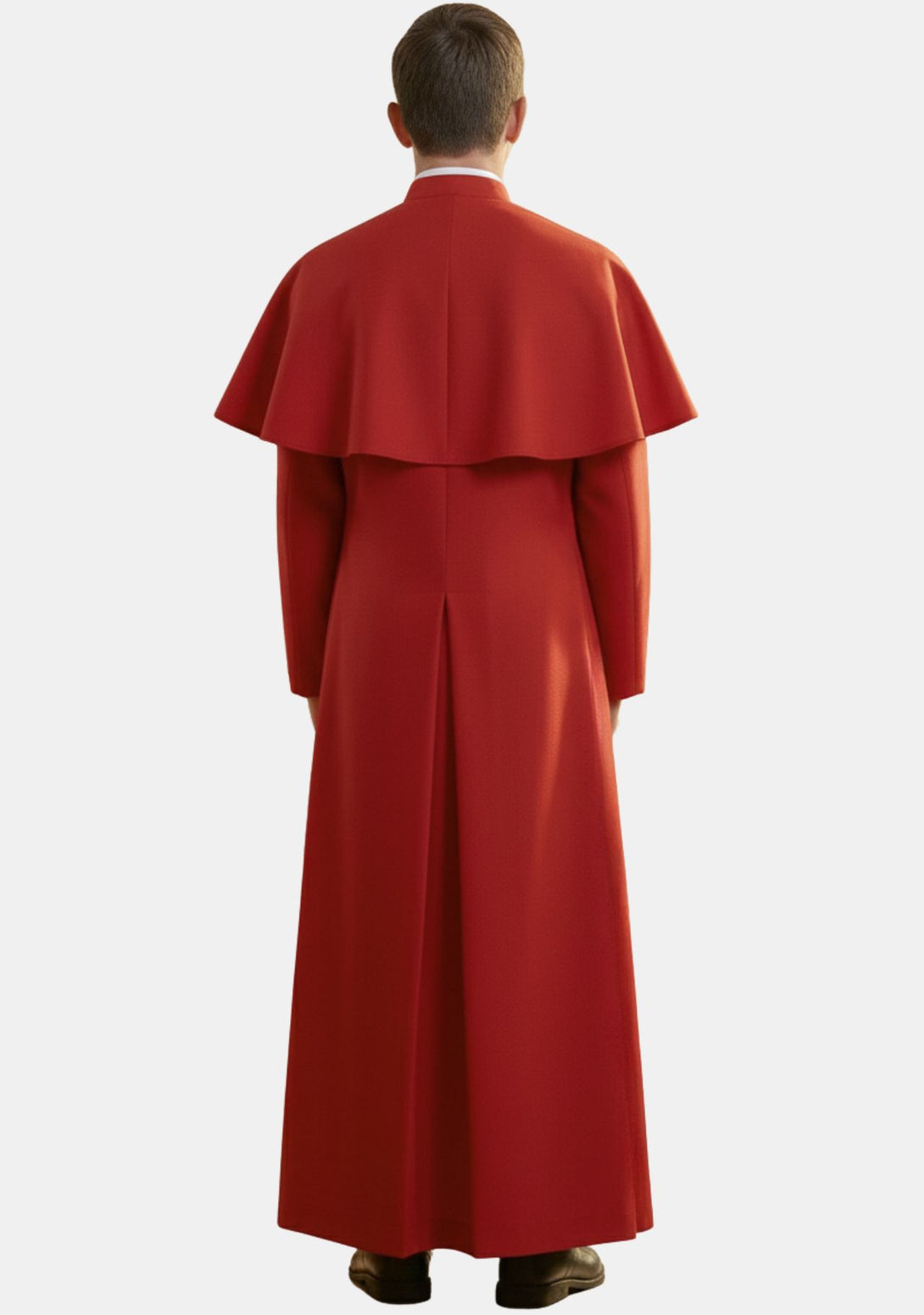 Made with a soft, durable tropical suiting blend, this cassock provides long-lasting strength while remaining gentle and comfortable against the skin. The lightweight and breathable nature of the fabric makes it ideal for extended services, helping young servers stay cool and at ease while performing their duties. The front features fabric-covered buttons that enhance the traditional look, while the cape drapes beautifully to complete the classic church appearance. Available in multiple sizes, it ensures a smooth and well-balanced fit for growing boys from size 7 to 20.