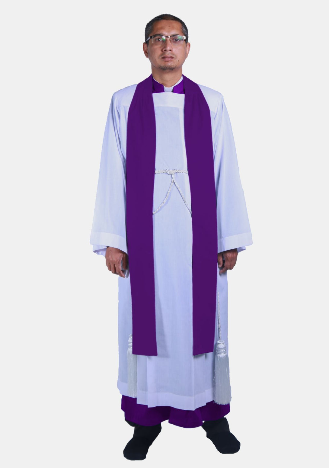 - The classic stole design is enhanced with a rich purple color, adding a touch of reverence and dignity to your outfit. Each side measures 50 inches in length, providing an elegant drape that complements any ceremonial garment.
