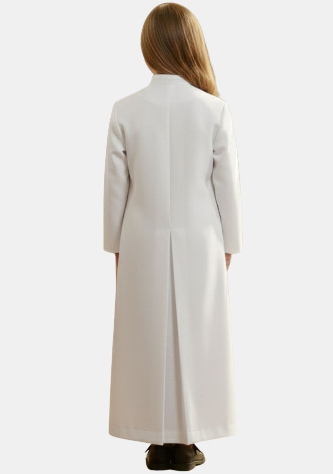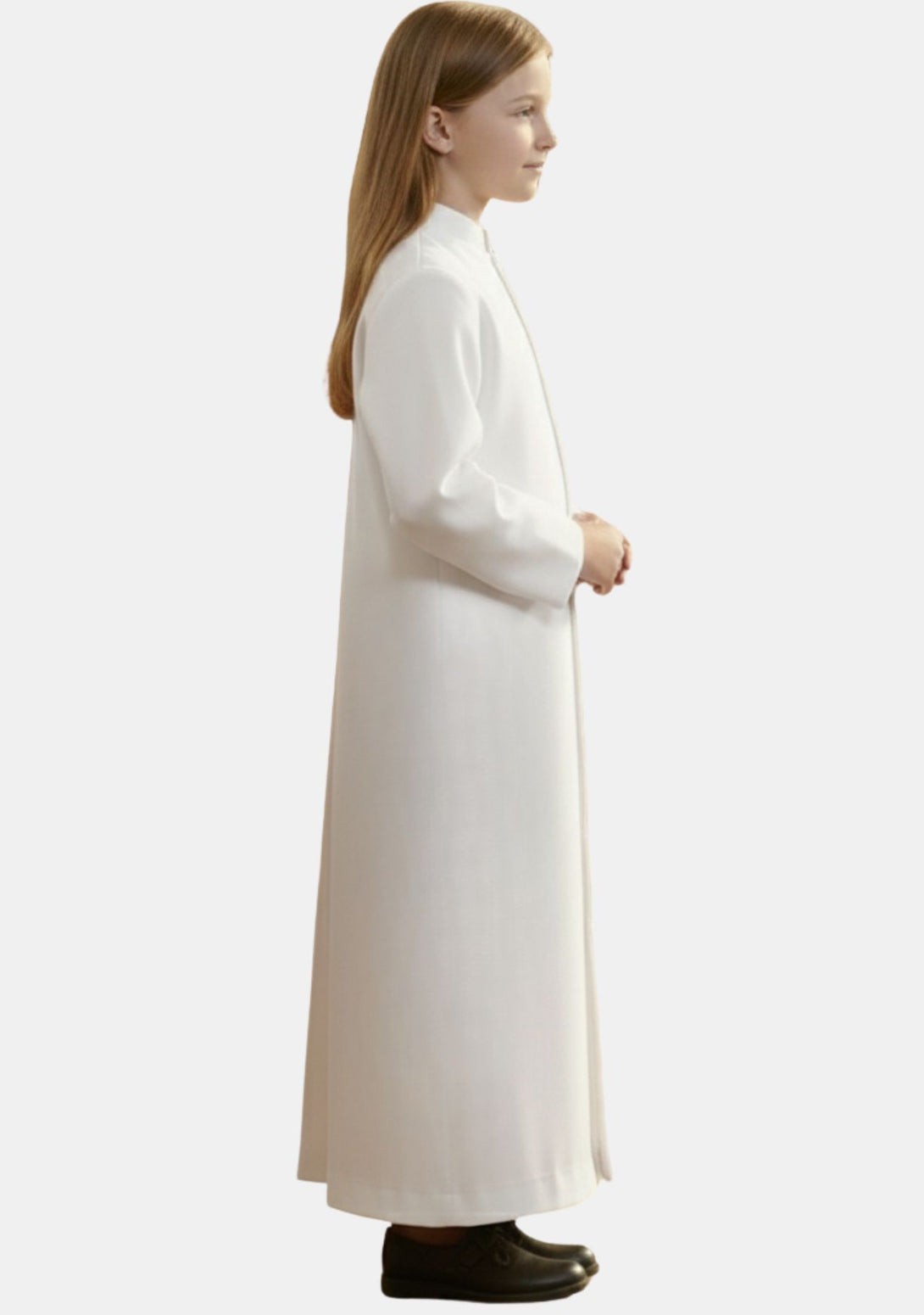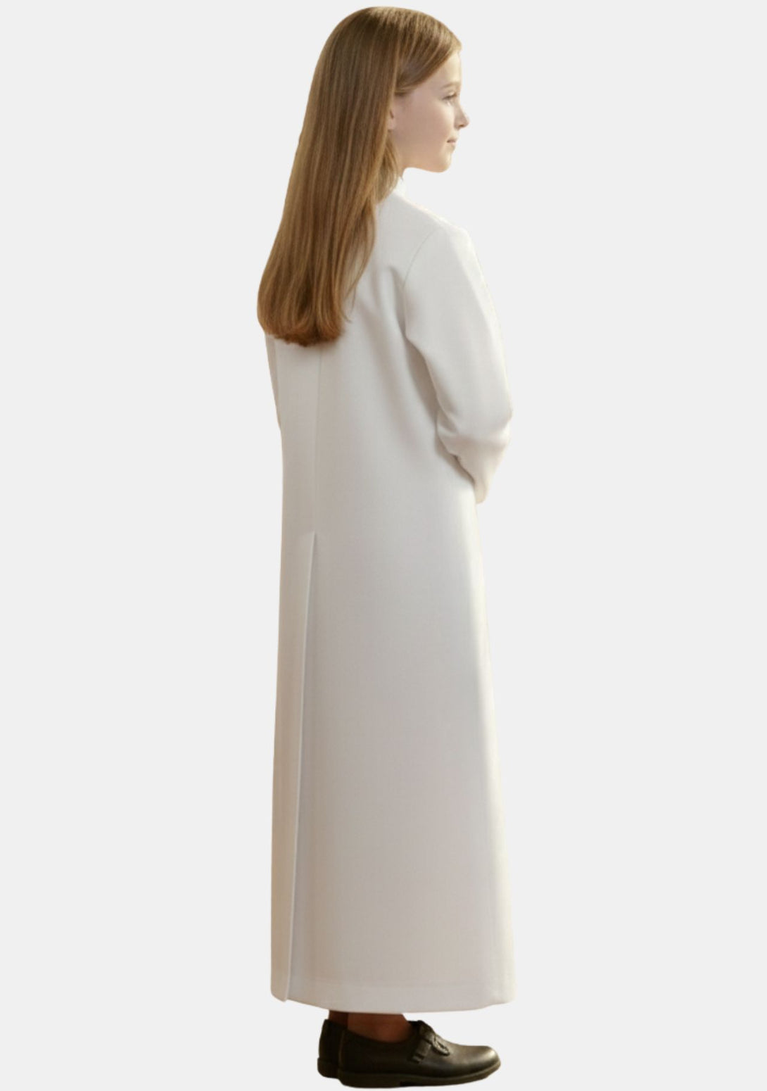 With its pure white color, traditional shoulder cape, polished buttons, breathable construction, and long-lasting quality, the Madilyn Pure White Girls Cassock stands out as a meaningful, elegant, and reliable choice for young girls serving in ministry.