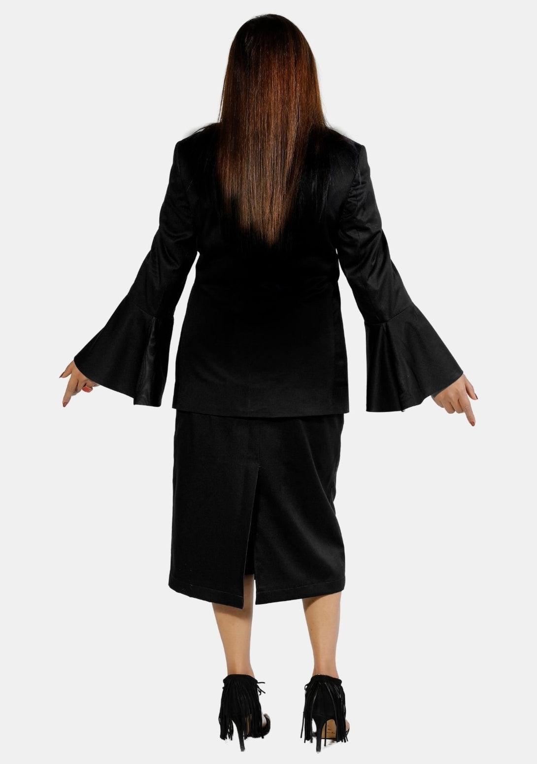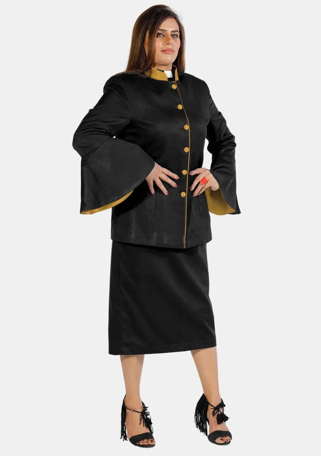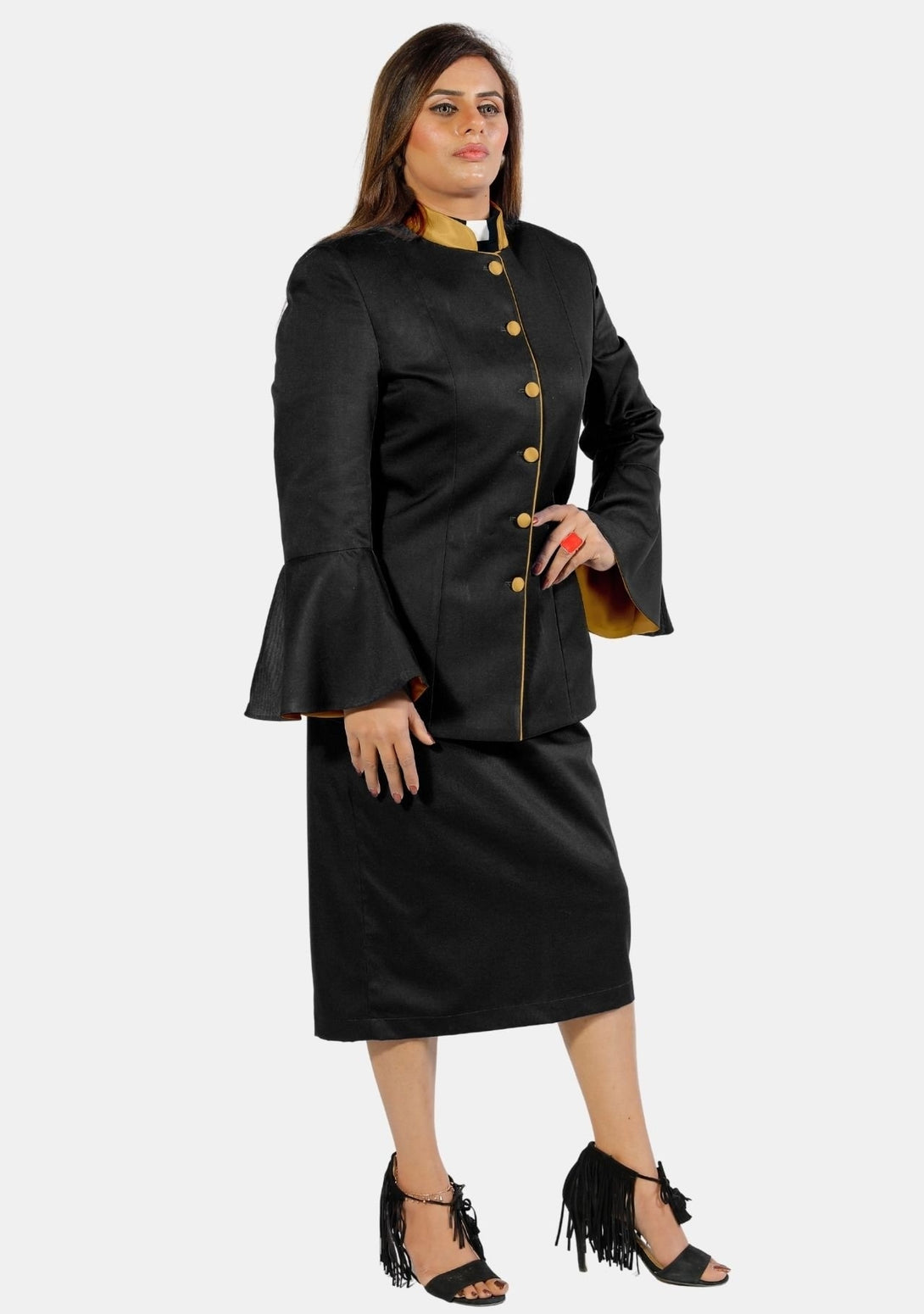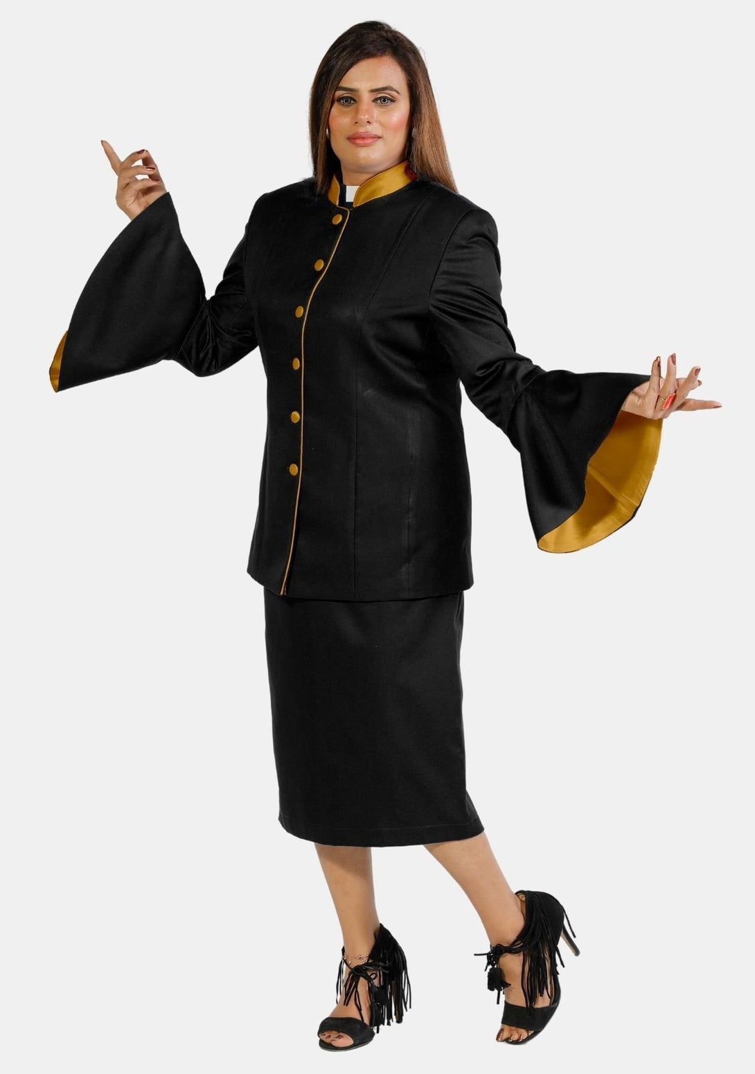A Symphony of Style and Spirit: Women’s Clergy Suit Flared Sleeve – Black/Gold