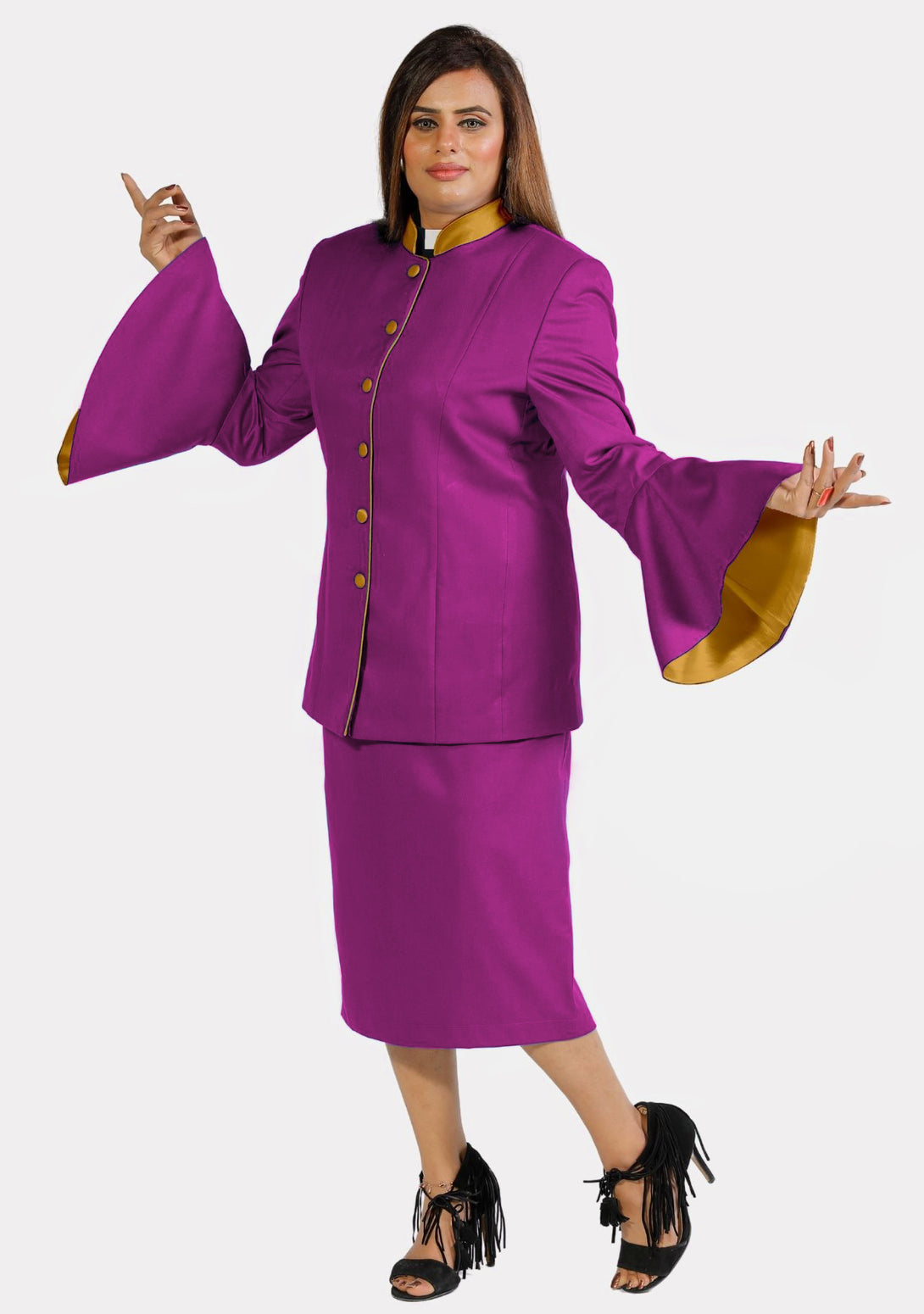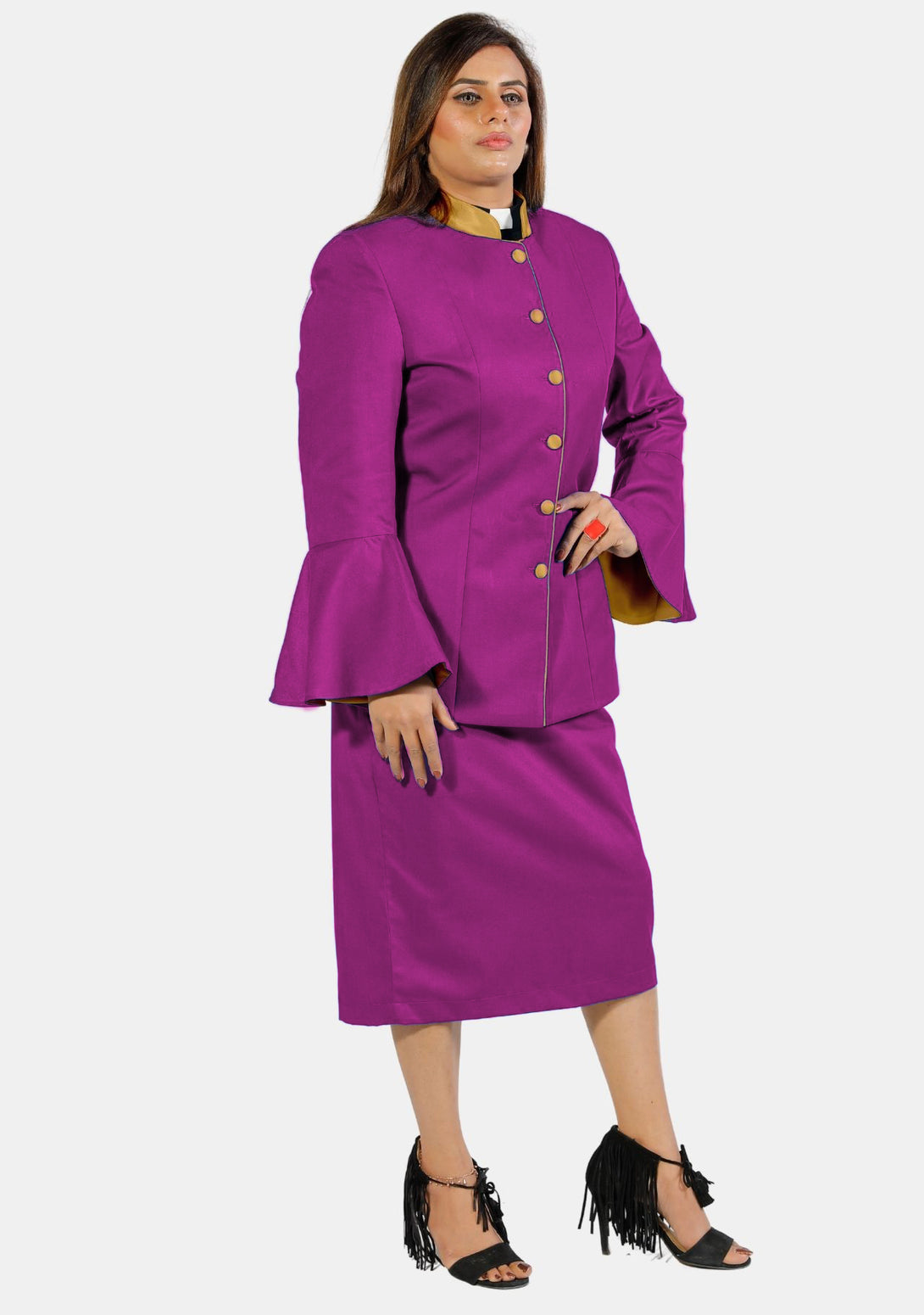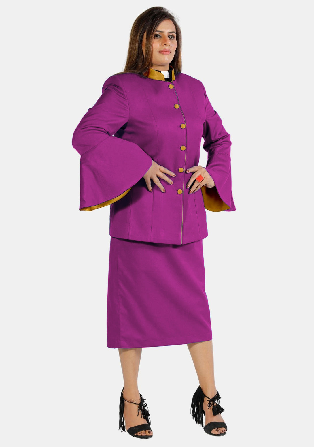 Introducing our Women’s Clergy Suit Flared Sleeve in Red Purple. This suit is graceful and stylish, showing your commitment and respect. It mixes traditional clergy clothing with modern style. The purple color, with gold touches, represents spirituality and dignity, matching your sacred role.