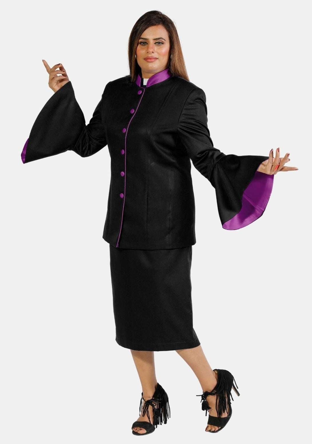 Women’s Clergy Suit Flared Sleeve in Black/Purple is a special outfit for women leading with faith and style. This suit combines traditional clergy clothing with a modern touch, making it perfect for important service moments.