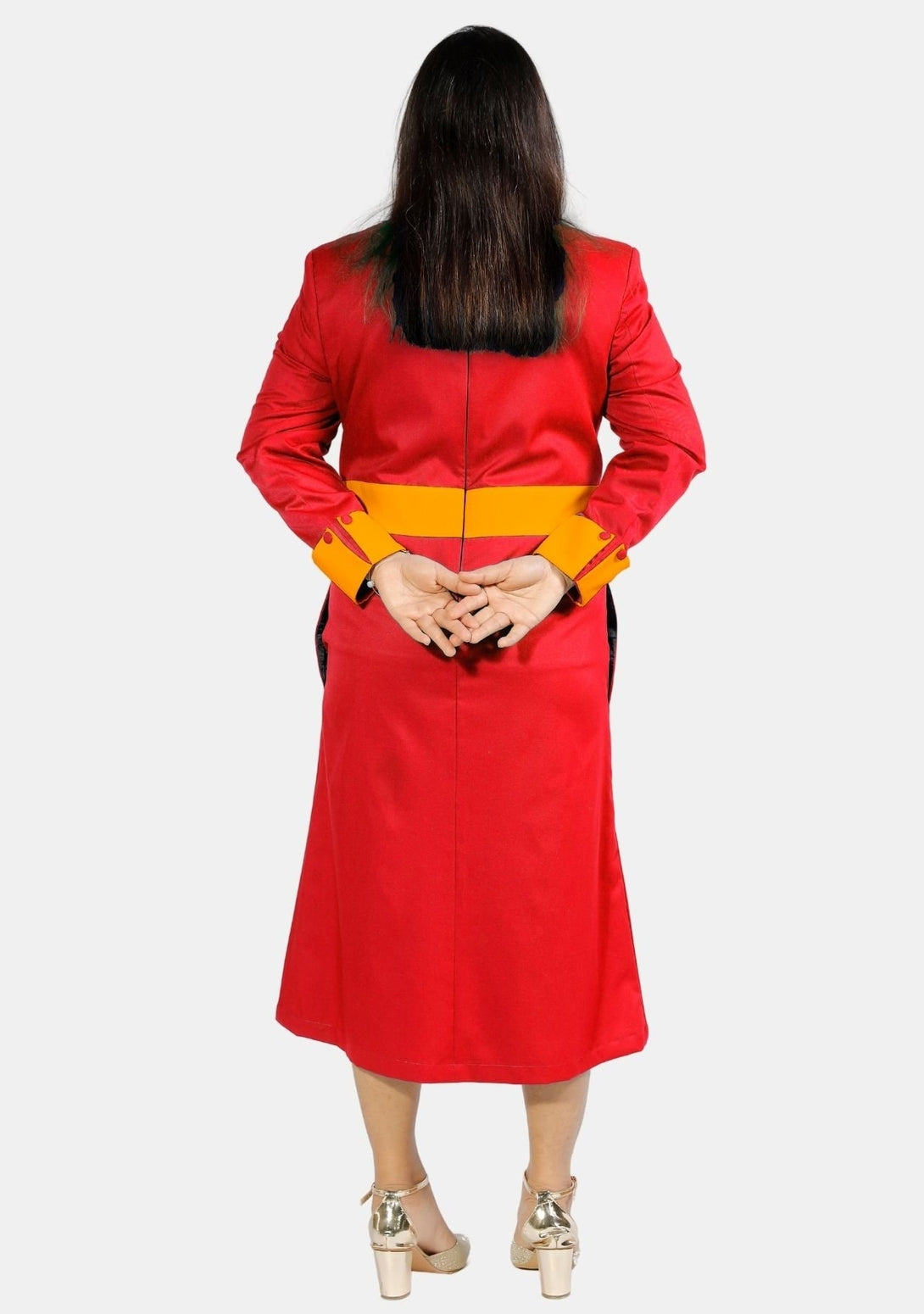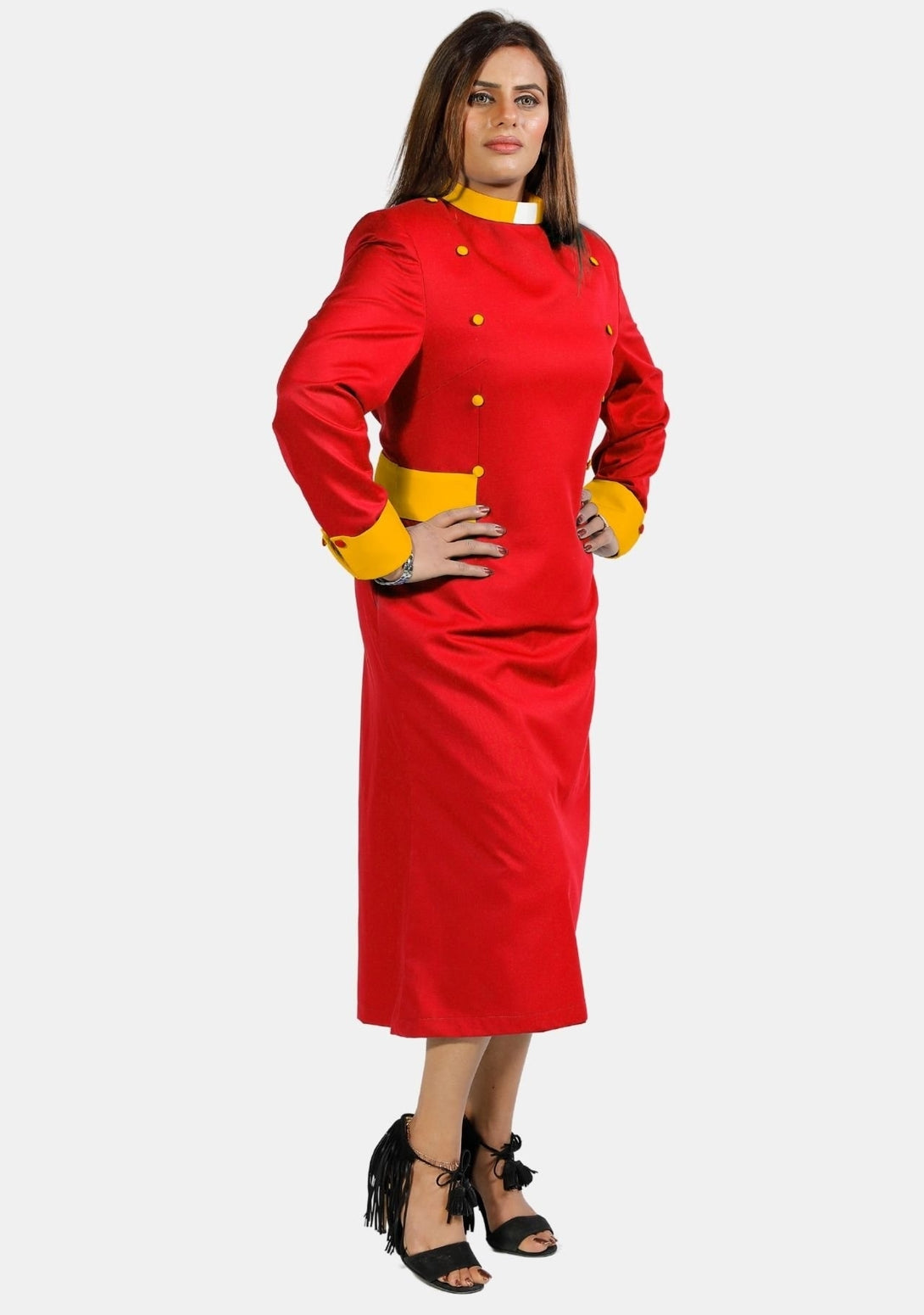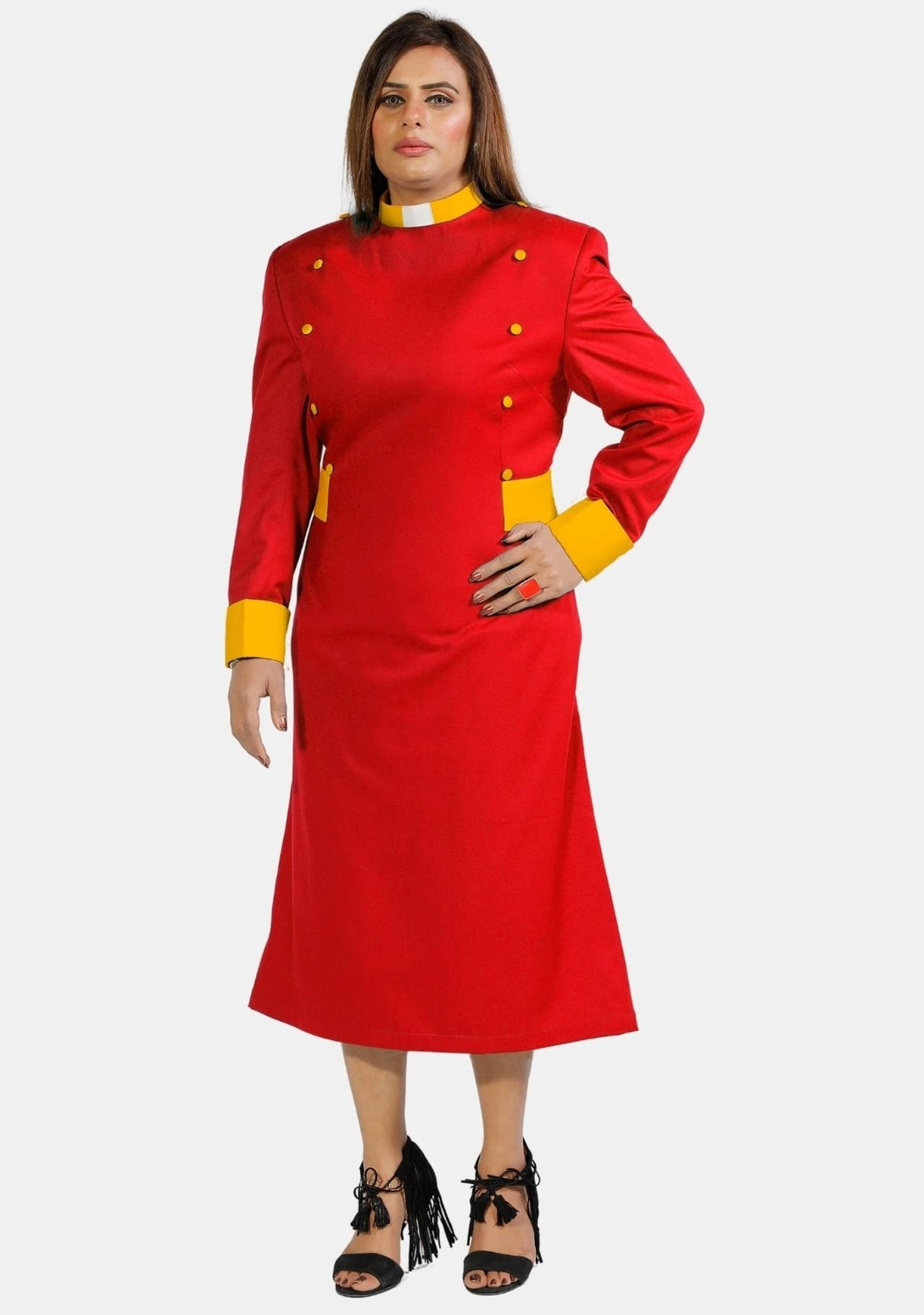 Our clergy dress shows how important women have been in religion for a long time. The bright red color shows confidence and passion. Shiny gold buttons make it special, showcasing the grace and style of women ministers.