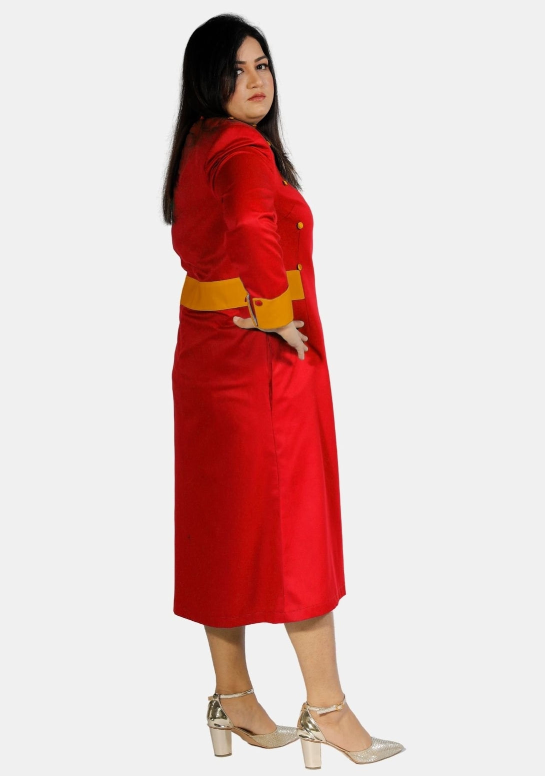 Radiance in Reverence: Women’s Clergy Dress Red with Gold Designer Buttons