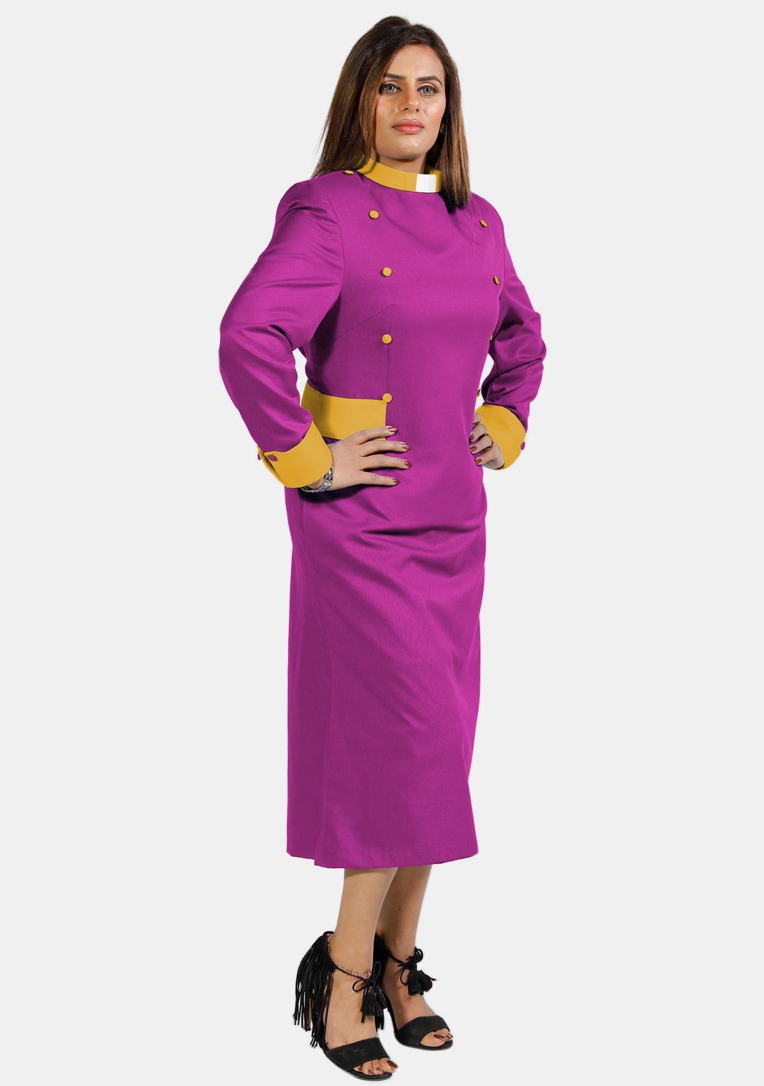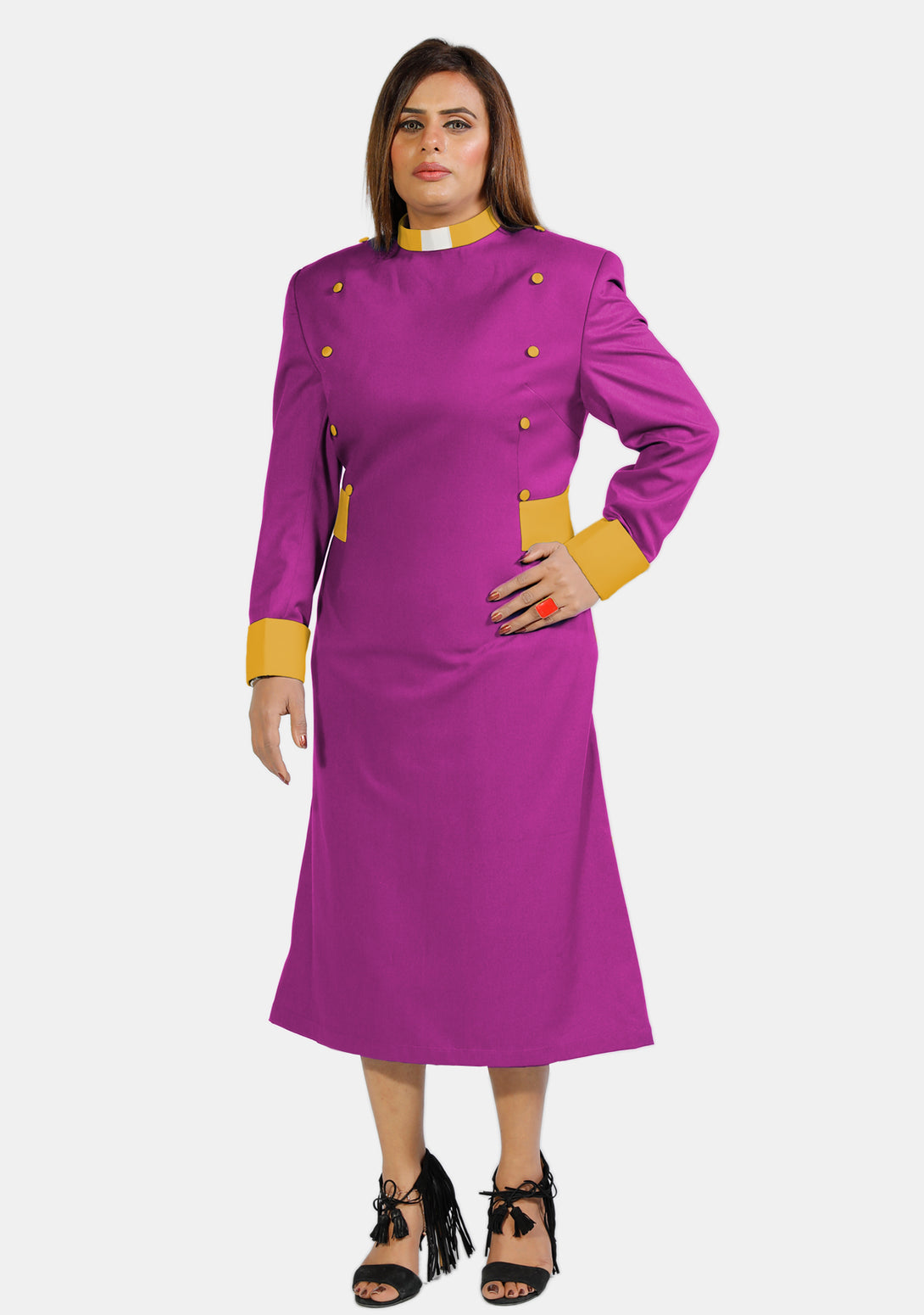 Get ready for your important role confidently and gently with our Womens Clergy Dress Red Purple with Gold Designer Buttons. We carefully craft this dress to ensure it looks nice and helps you feel good and professional during your ministry duties.